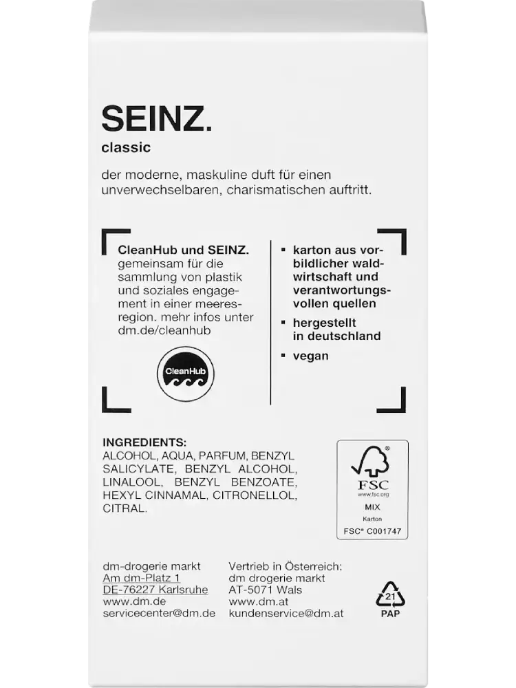 L’Eau de Toilette Classic de SEINZ. est une véritable révolution parmi les parfums. Elle diffuse une fragrance à la fois moderne et masculine. Elle est donc idéale pour un style charismatique et inoubliable qui ne manquera pas de séduire votre entourage.