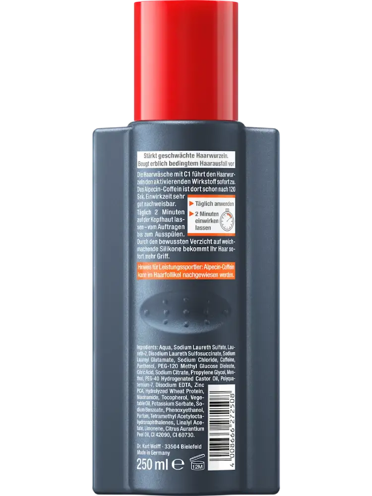 يُعد Alpecin Coffein-Shampoo C1 العناية المثالية للرجال الذين يعانون من تساقط الشعر الوراثي. تركيبته الخاصة مع مركّب الكافيين تعمل مباشرة على جذور الشعر وتقوم بتحفيزها. ومع الاستخدام المنتظم، يمكن للشامبو إطالة مراحل نمو الشعر وبالتالي المساعدة في تقليل التساقط. كما أن الاستغناء المتعمّد عن السيليكونات الملمّعة يحسّن بنية الشعر ويمنحه تماسكًا فوريًا. للحصول على شعر أقوى وأكثر كثافة.