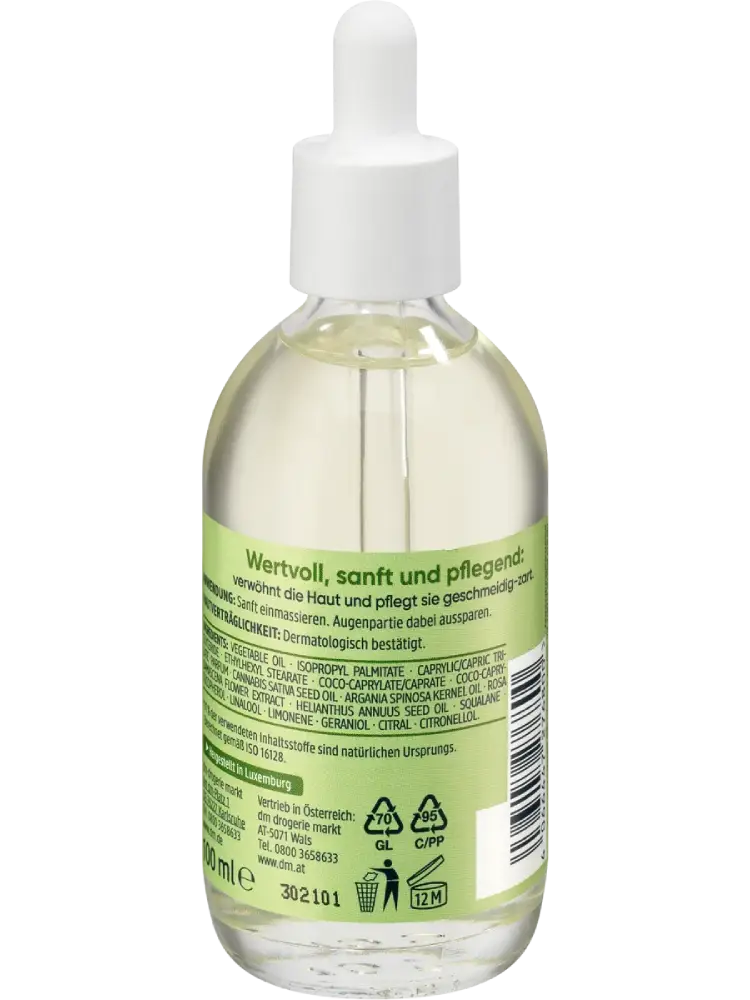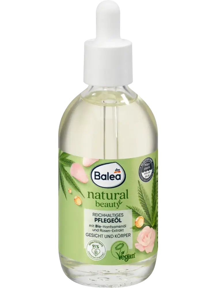 زيت العناية Balea Natural Beauty Bio مناسب للوجه والجسم. يعمل زيت بذور القنب العضوي القيّم ومستخلص الورد على تدليل البشرة وجعلها ناعمة وملساء. تم تأكيد توافقه مع البشرة جلدياً.