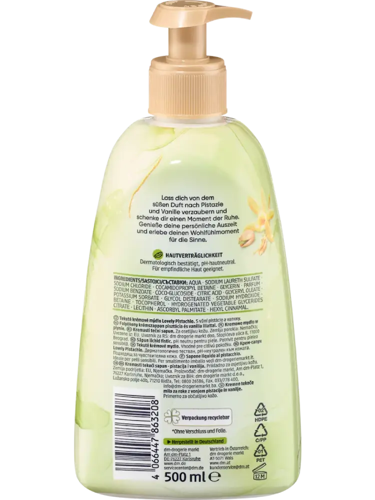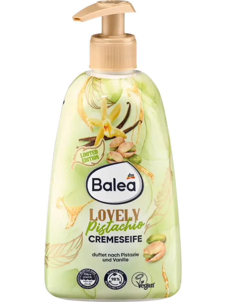 مع صابون Balea السائل Lovely Pistachio ينتشر في الحمام عطر لطيف من الفستق والفانيليا. وبفضل تركيبته اللطيفة فهو مناسب بشكل خاص للبشرة الحساسة ويترك إحساسًا مريحًا ومعتنى به بعد غسل اليدين.