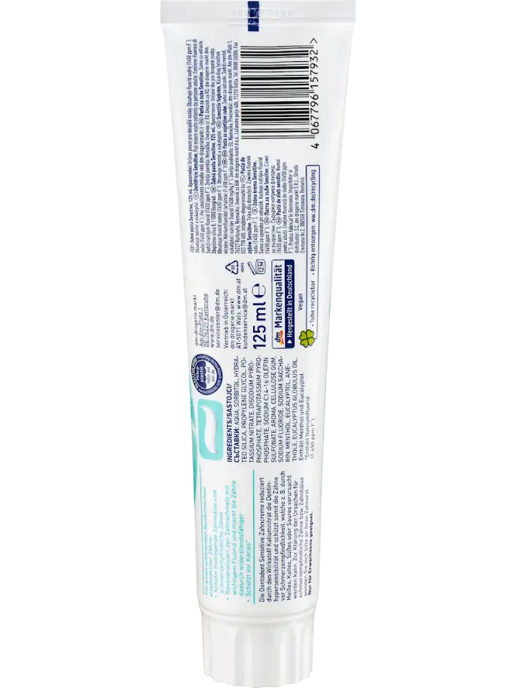 تم تطوير معجون الأسنان Sensitive من Dontodent خصيصًا لتلبية احتياجات الأسنان الحساسة. وبفضل مزيجه المنعش من المنثول والأوكاليبتول يمنح إحساسًا منعشًا في الفم ويوفر حماية لطيفة وشاملة للمناطق الحساسة من الأسنان.