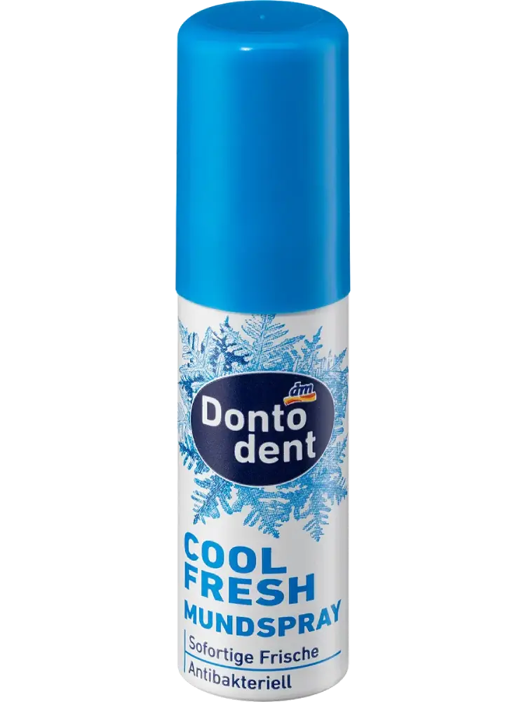 يوفر بخاخ الفم Dontodent Cool Fresh مع زيت المريمية والمادة الفعالة بيسابولول من البابونج انتعاشًا فوريًا ويعمل كمضاد للبكتيريا. كما أن تركيبته نباتية وتستخدم نظام مضخة صديقًا للبيئة بدون غاز دافع.