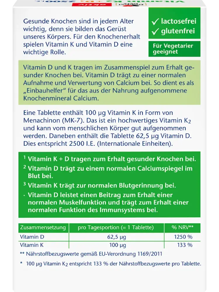 تساهم أقراص فيتامين K2 + D3 بتركيز 2500 وحدة دولية من Doppelherz، بفضل فيتاميني K وD، في الحفاظ على عظام طبيعية. كما يساعد فيتامين K في الحفاظ على عملية تخثّر دم طبيعية. ويساهم فيتامين D أيضاً في دعم الوظيفة الطبيعية للجهاز المناعي.