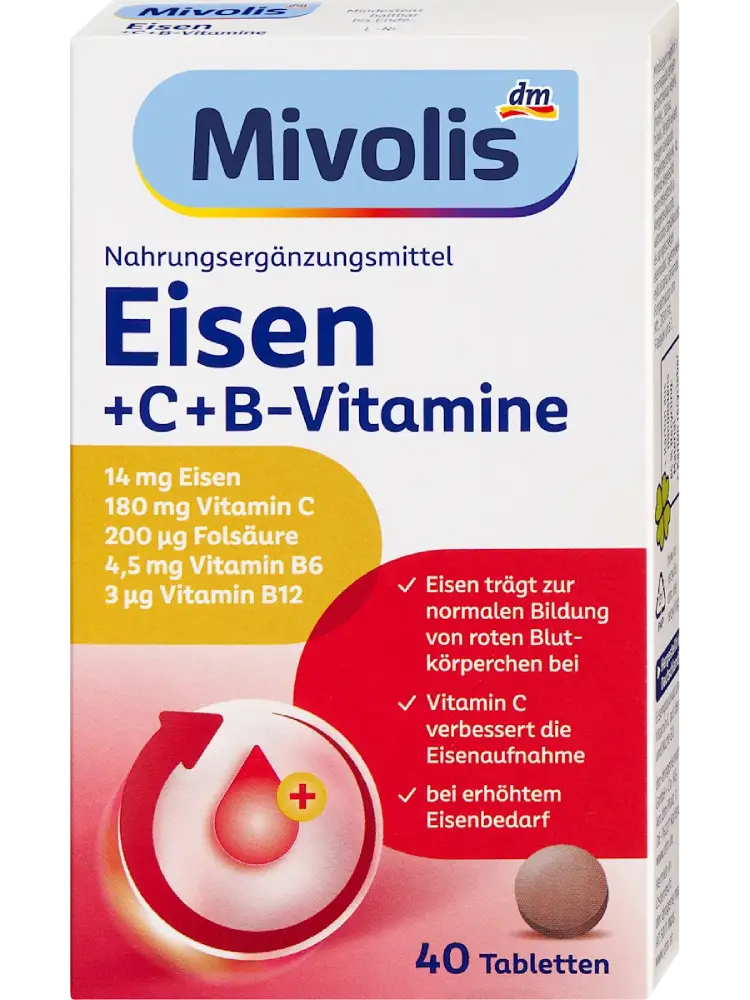 يساهم منتج Mivolis الحديد + فيتامين C + فيتامينات B، بفضل تركيبته المتوازنة من الحديد وفيتامين C (الذي يساعد على امتصاصه)، في دعم إمداد الجسم بالحديد. كما يمكن لمزيج الحديد وفيتامين C وفيتامين B12 وفيتامين B6 وحمض الفوليك أن يكمّل مدخول الفيتامينات. يدعم معدن الحديد العديد من وظائف الجسم مثل التكوين الطبيعي لخلايا الدم الحمراء والهيموغلوبين، ونقل الأكسجين في الدم، وعملية الأيض الطبيعي للطاقة. كما يساهم الحديد في تقليل التعب والإرهاق ودعم الوظائف الإدراكية الطبيعية.