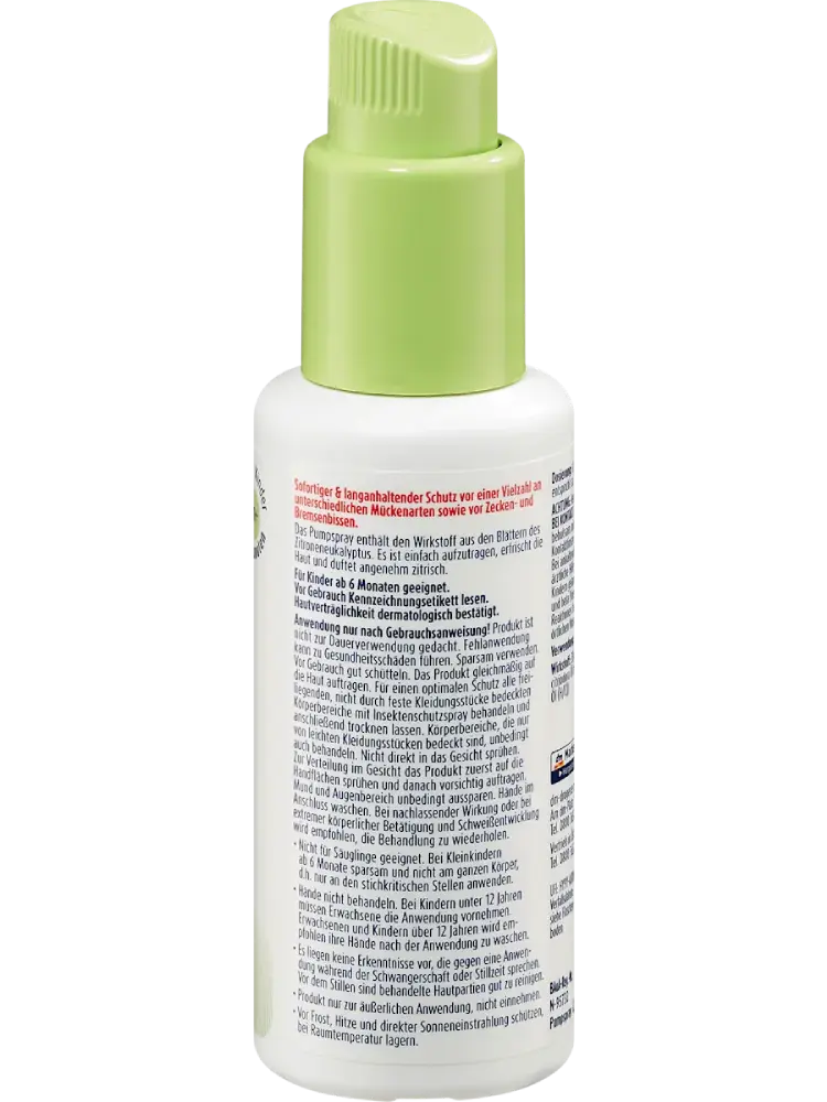 يوفر بخاخ طارد الحشرات بزيت الأوكالبتوس الليموني من S-QUiTO free حماية تصل إلى 6 ساعات ضد لدغات الذباب القارص والبعوض وعضّات القراد. كما أنه مناسب للأطفال من عمر 6 أشهر، ويتم استخراج المادة الفعالة من أوراق الأوكالبتوس الليموني