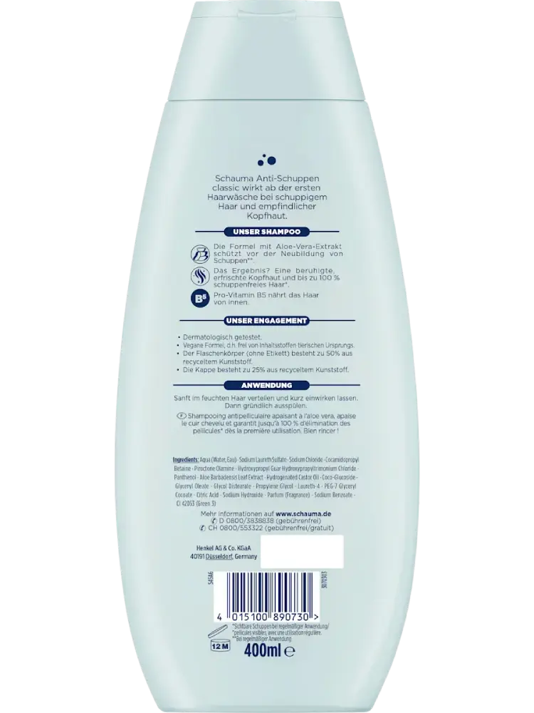 تم تطوير شامبو Anti-Schuppen Classic من Schauma لتلبية احتياجات الشعر المصاب بالقشرة. تركيبته التي تحتوي على مستخلص الألوفيرا وبروفيتامين B5 تحارب القشرة الظاهرة من أول استخدام وتعمل على تهدئة فروة الرأس. ومع الاستخدام المنتظم، يساعد الشامبو على منع ظهور القشرة من جديد. وبفضل تركيبته النباتية، يتم الاعتناء بالشعر وتبقى فروة الرأس منتعشة ومريحة – لمظهر شعر صحي ومعتنى به.