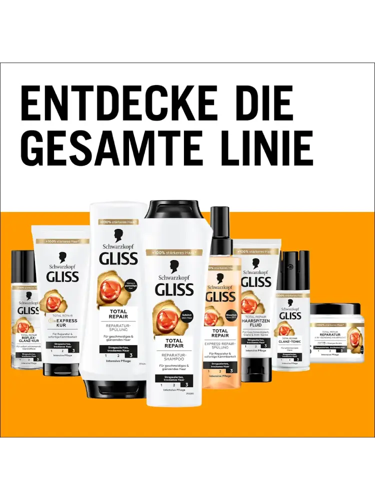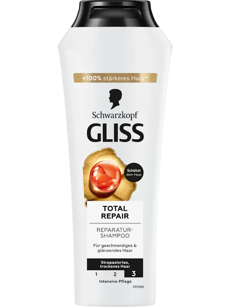 يُعد شامبو Total Repair من Schwarzkopf GLISS مثاليًا للشعر الجاف والمتضرر. تجمع تركيبته بين الكيراتين السائل ورحيق الأزهار لحماية ألياف الشعر. كما ينظف الشعر ويغذيه ويمنحه إحساسًا بالنعومة والمرونة واللمعان