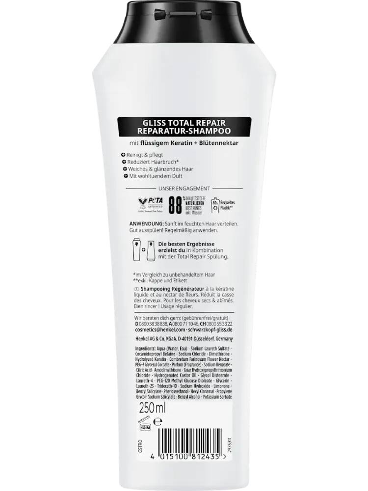 Le shampooing Total Repair de Schwarzkopf GLISS est idéal pour les cheveux secs et abîmés. Sa formule associe kératine liquide et nectar de fleurs pour protéger la fibre capillaire. Il nettoie et nourrit les cheveux tout en leur donnant souplesse, douceur et brillance.