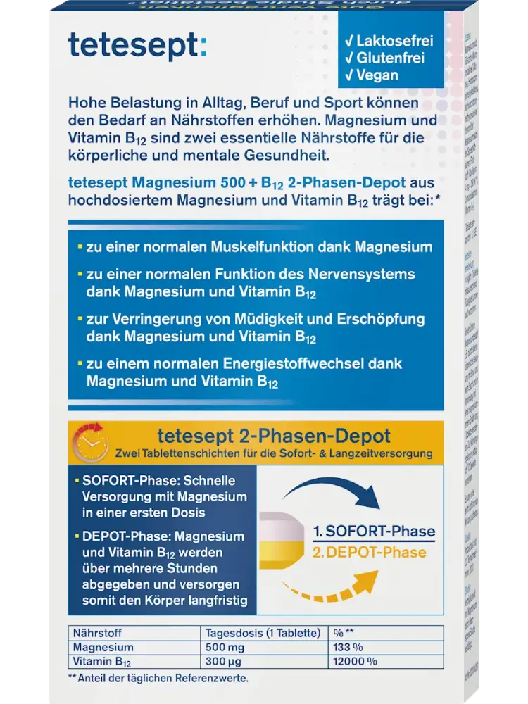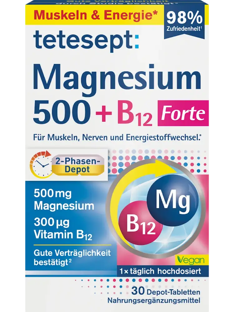 يحتوي tetesept Magnesium 500 + B12 Depot بنظام الإطلاق على مرحلتين على مغنيسيوم بجرعة عالية وفيتامين B12. يساهم المغنيسيوم في الوظيفة الطبيعية للعضلات وكذلك في عمل الجهاز العصبي بشكل طبيعي والتمثيل الغذائي الطبيعي للطاقة.