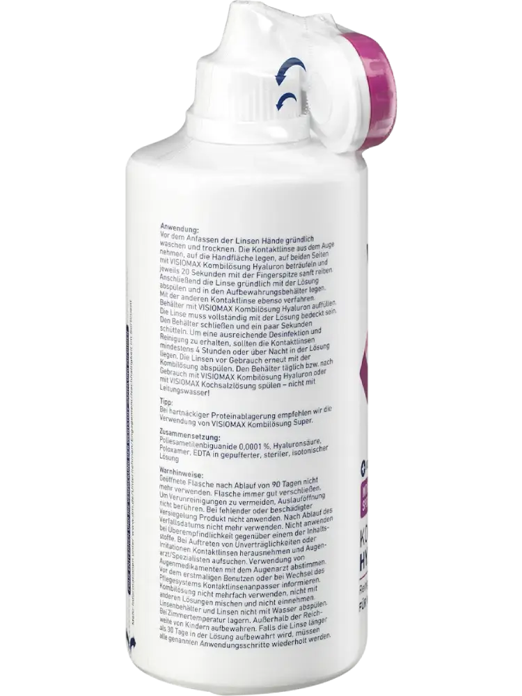 قبل لمس العدسات اللاصقة يجب غسل اليدين جيدًا وتجفيفهما. أخرج العدسة من العين وضعها على راحة اليد. ضع بضع قطرات من محلول VISIOMAX متعدد الاستعمالات مع الهيالورون على جانبي العدسة وافركها بلطف بطرف الإصبع لمدة حوالي 20 ثانية.بعد ذلك اشطف العدسة بالمحلول لمدة 5 ثوانٍ على الأقل وضعها في علبة حفظ العدسات. املأ العلبة بمحلول VISIOMAX Hyaluron بحيث تكون العدسة مغطاة بالكامل بالمحلول. كرر نفس الخطوات مع العدسة الأخرى.أغلق العلبة ورجّها لبضع ثوانٍ. للحصول على تنظيف وتعقيم كافيين يجب ترك العدسات في المحلول لمدة لا تقل عن 6 ساعات أو طوال الليل. قبل الاستخدام اشطف العدسات مرة أخرى بمحلول VISIOMAX.يجب شطف علبة العدسات يوميًا أو بعد الاستخدام بالمحلول أو بمحلول ملحي (ولا يُستخدم ماء الصنبور!) ثم تُترك مفتوحة لتجف